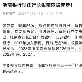 【聊聊“3万亿银行行长因个人原因辞职”这事】据报道,浙商银行的行长被警察带走。为了降低这一事件的负面影响,相关方面可能采取了让他先辞职,再实施抓捕的措施。这种操作与某些将人员先调至边缘部门,再进行抓捕的做法如出一辙。